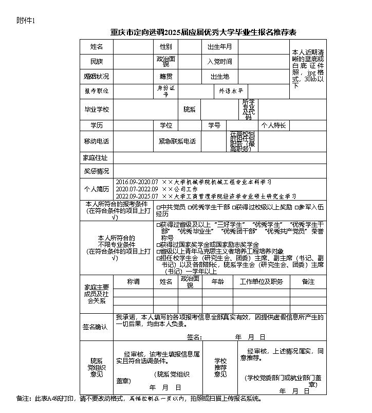 附件:1. 重庆市定向选调2025届应届优秀大学毕业生报名推荐表