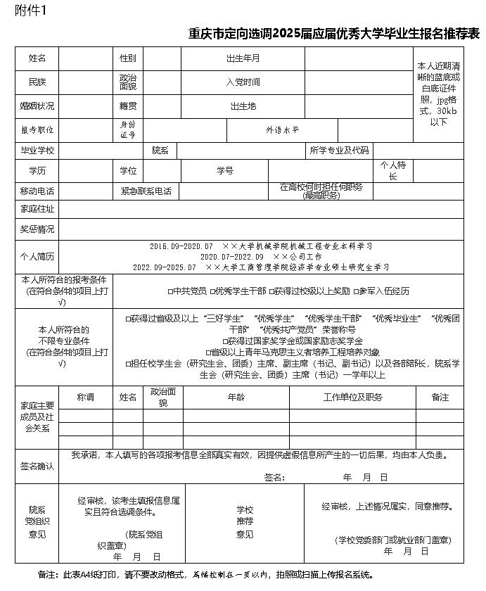 附件:1. 重庆市定向选调2025届应届优秀大学毕业生报名推荐表